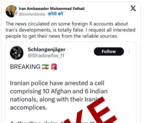FAKE NEWS : भारत में ईरान के राजदूत ने पाकिस्तान के इस दावे को सिरे से खारिज कर दिया है जिसमें वो कह रहा था कि ईरान ने 6 भारतीयों को गिरफ्तार किया है. पाकिस्तान ने दावा किया था कि भारतीयों के साथ-साथ ईरान ने 10 अफगान नागरिकों को भी गिरफ्तार किया है। पाकिस्तान के इन फर्जी दावों को लेकर भारत में ईरान के राजदूत मोहम्मद फथाली ने एक सोशल मीडिया पोस्ट में उन्होंने लिखा है कि ईरान के घटनाक्रम को लेकर कुछ विदेशी एक्स अकाउंट्स पर प्रसारित खबरें पूरी तरह से झूठी हैं. मैं सभी इच्छुक लोगों से अनुरोध करता हूं कि वे अपनी खबरें विश्वसनीय स्रोतों से हासिल करें। Post navigation Donald Trump का एक चौंकाने वाला दावा, ट्रुथ सोशल पोस्ट वायरल America and Iran : व्यापार करना पड़ेगा भारी, डोनाल्ड ट्रंप ने लगाया 25% टैरिफ